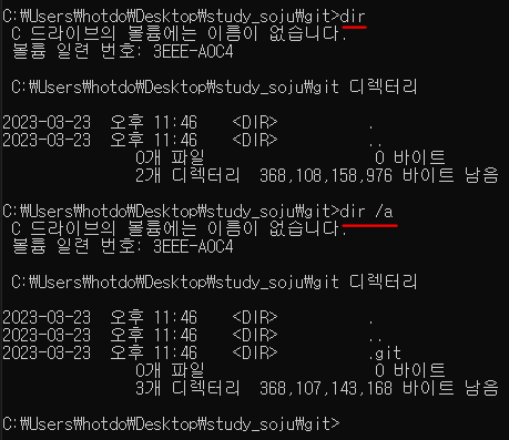 - 윈도우에서 목록보기 명령어는 dir. .git파일은 숨겨져 있기때문에 보기위해선 /a 옵션이 필요하다.