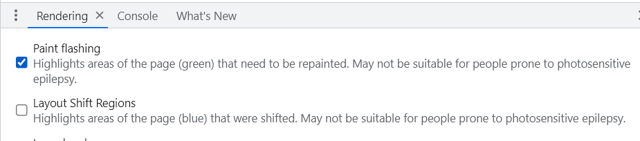 ✅ 크롬 개발자도구 > 렌더링 > Paint flashing 체크하면 리페인트가 발생하는 모습을 실시간으로 확인할 수 있다. (초록색으로 표시된 부분이 리페인트가 발생하는 부분)