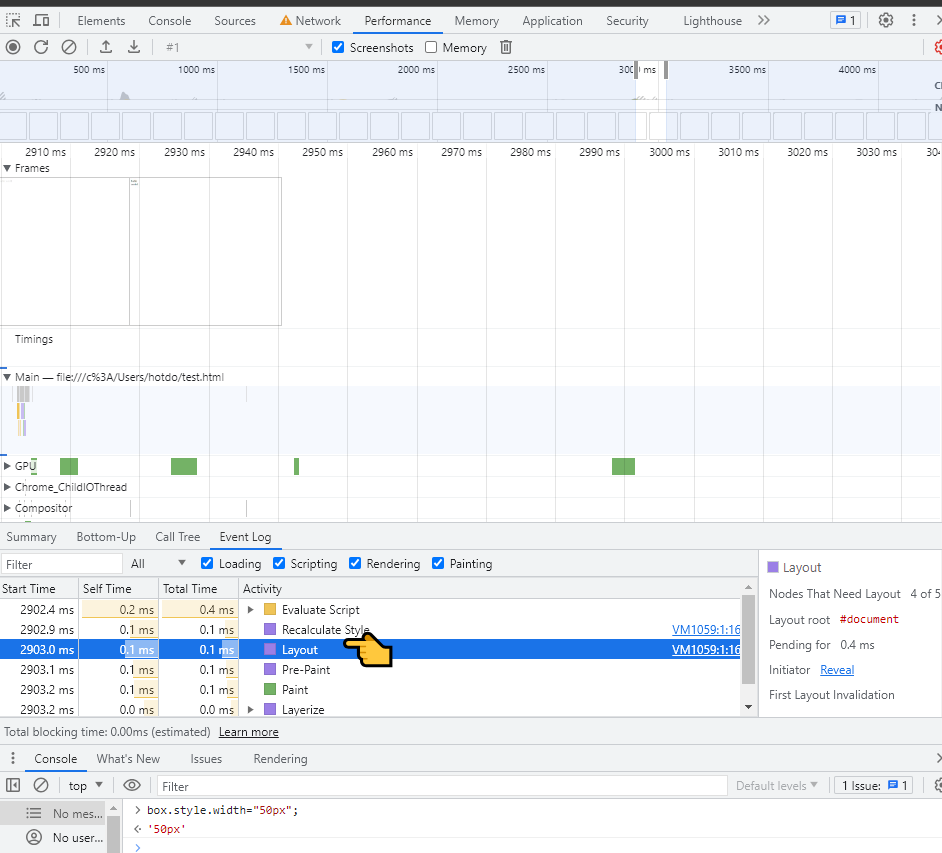 → div의 width 크기를 변경했다. 레이아웃 발생 후 리페인트가 발생되는 것을 확인할 수 있다.