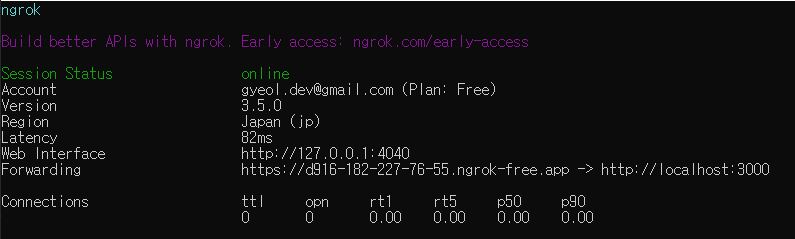 내 로컬서버의 포트번호는 3000이었기 때문에 ngrok http 3000으로 실행했다.