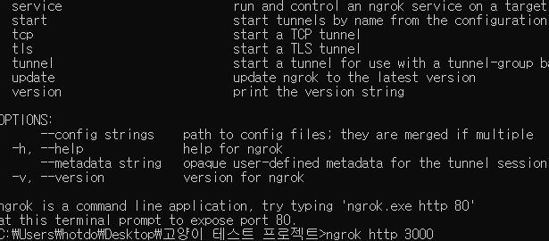 로컬 서버를 실행 시킨 후 ngrok에 아래와 같이 명령어를 실행한다.