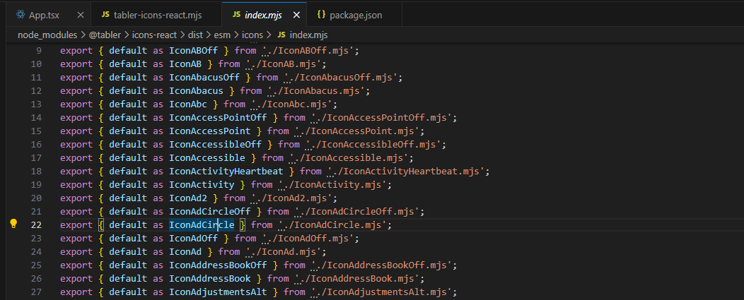 Vite는 @tabler/icons-react 전체 구조를 분석하지 않고, index.mjs 파일 하나만 번들에 포함시킨다.